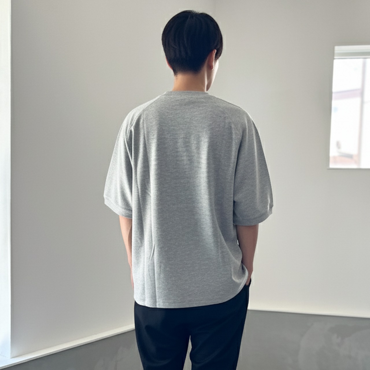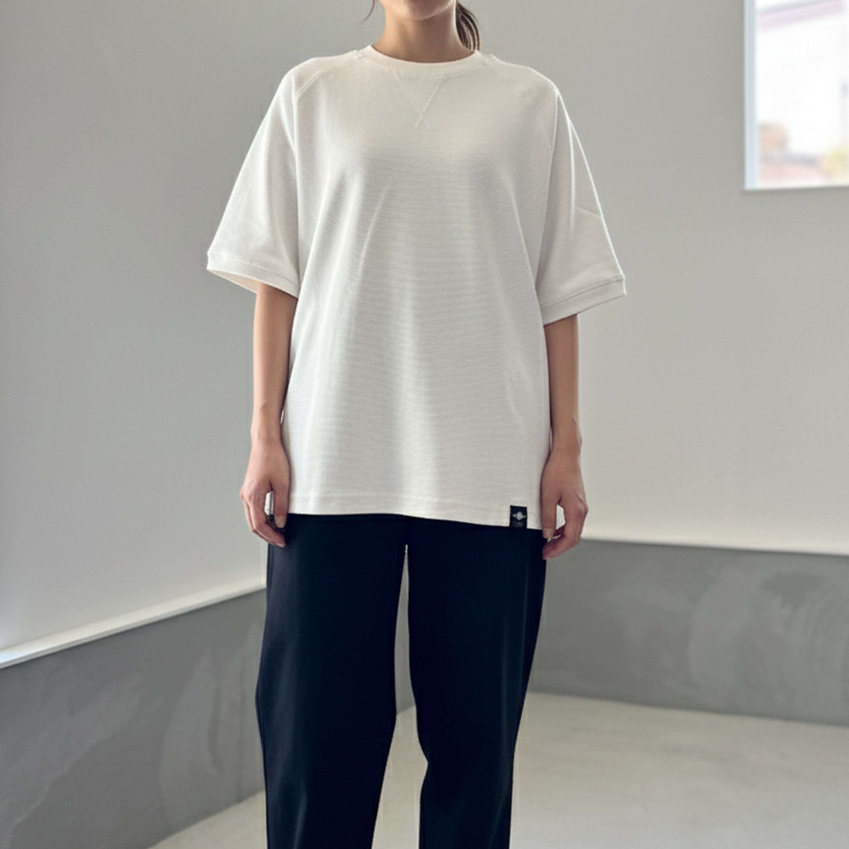 このTシャツは、表面にさりげない凹凸感のあるリップル生地を贅沢に二重仕立てにしたダブルフェイス生地を使用しています。