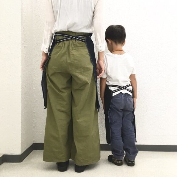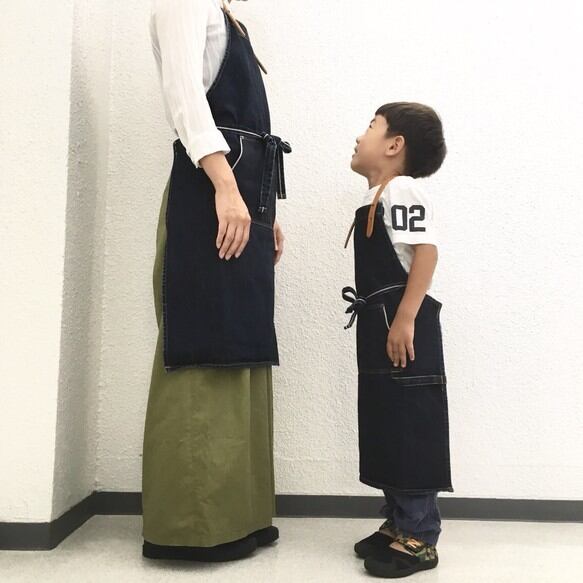 バイオウォッシュした14.7ozセルビッチデニムと極厚オイルヌメの親子コーデエプロンです。
