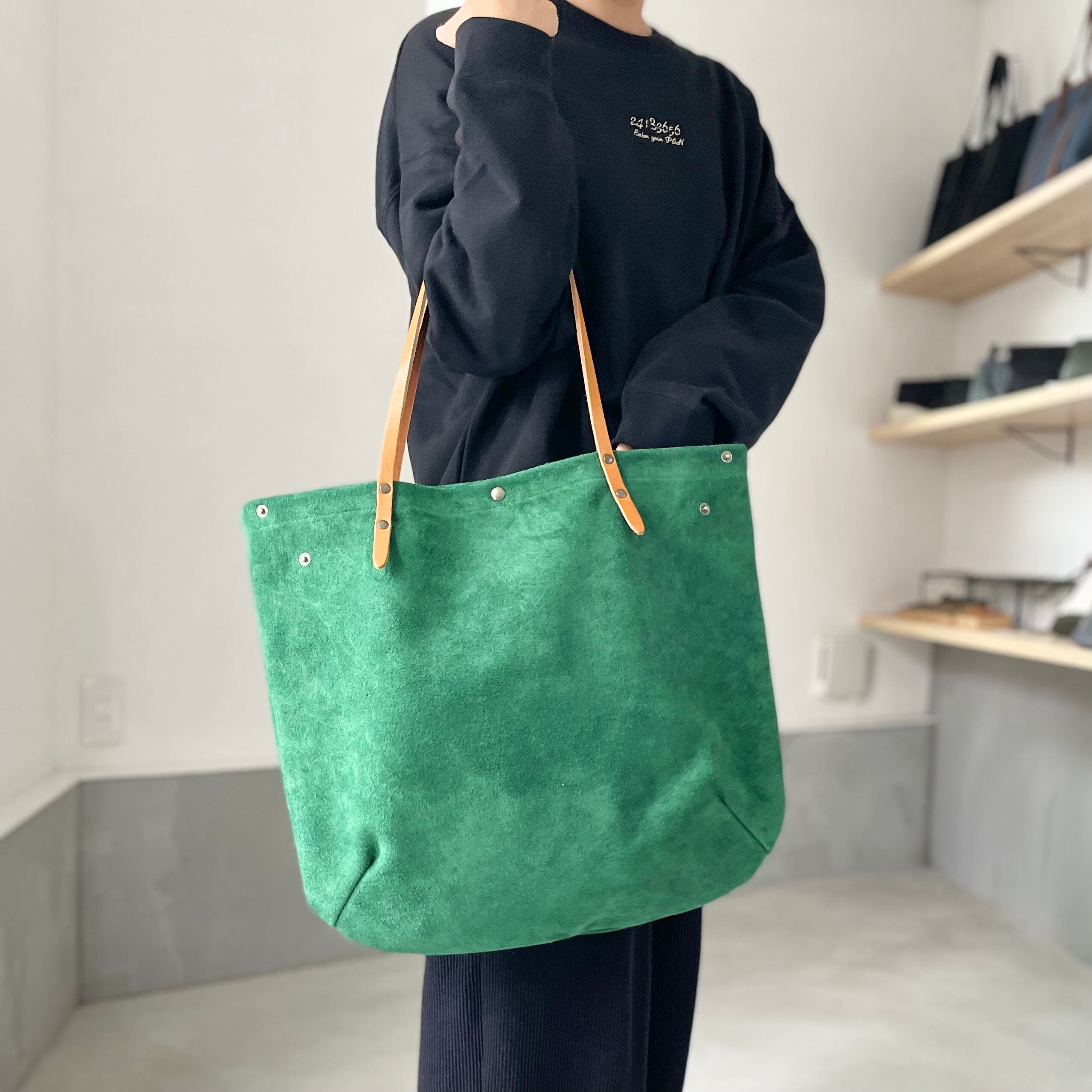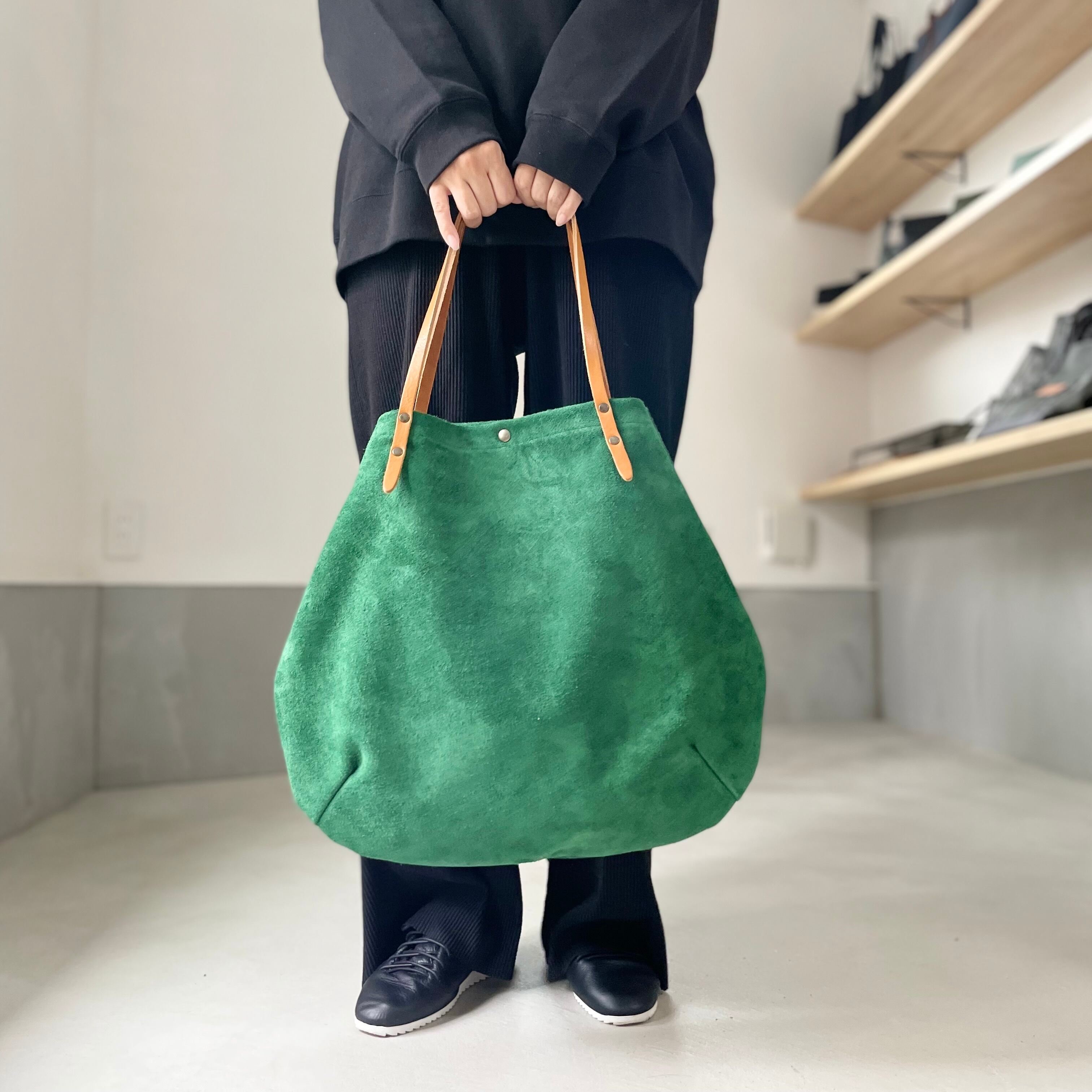 牛床ベロアと極厚オイルヌメの丸型トートバッグ L-size【オリーブ】