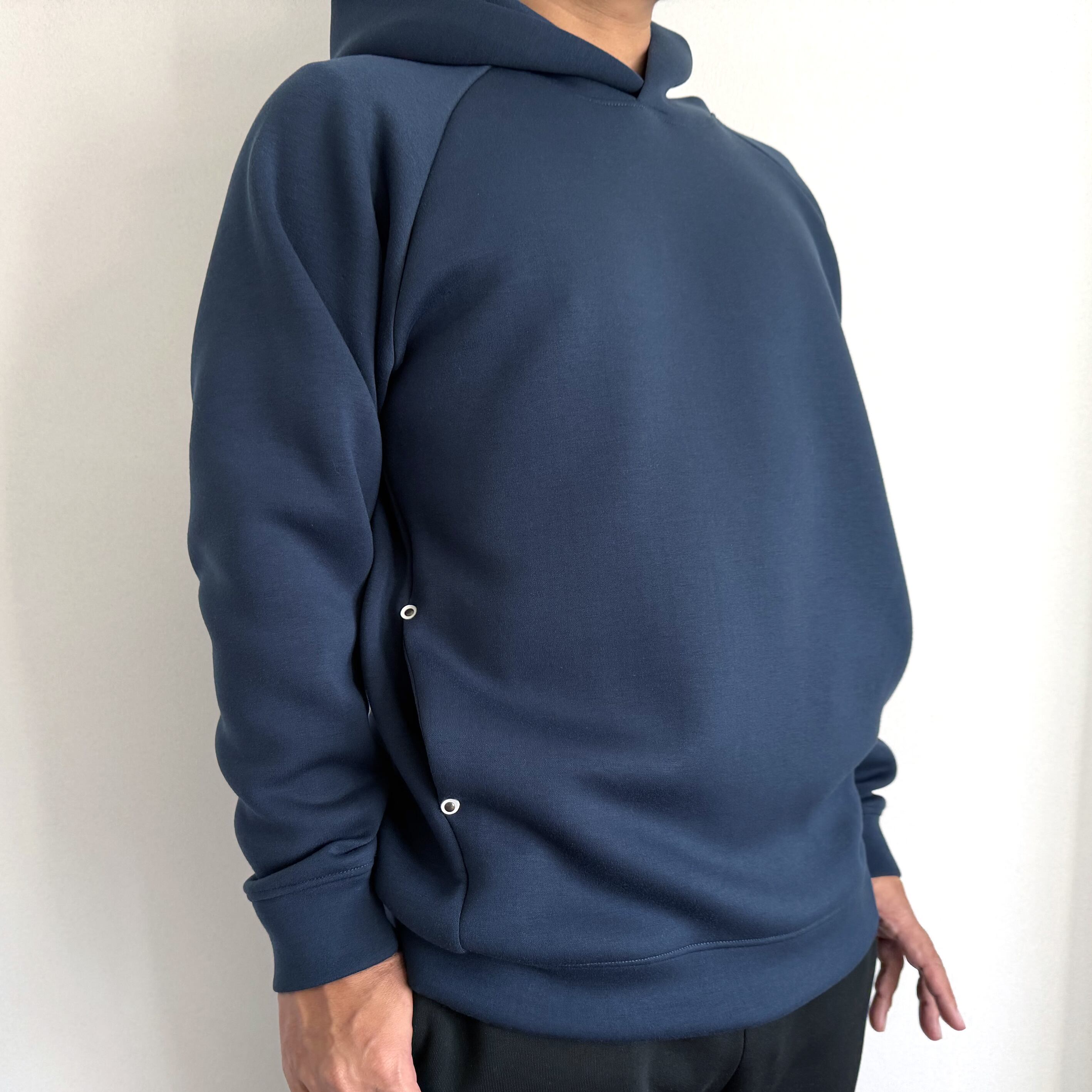 ネイビーは、男性 167cm Mサイズ着用です。