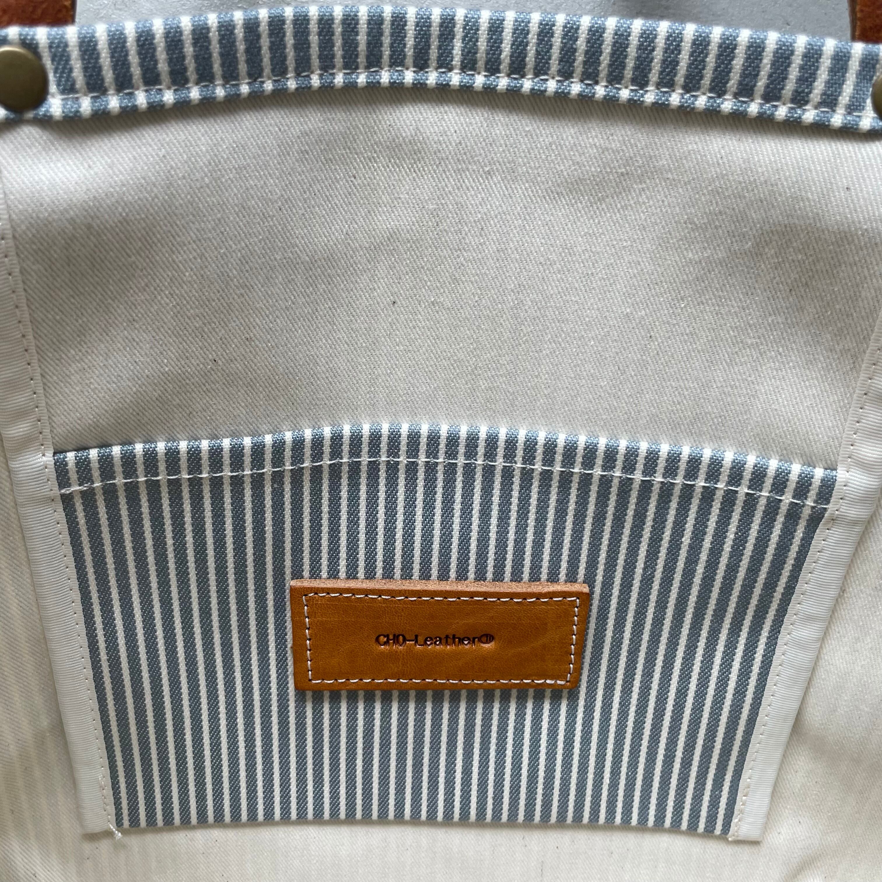 CHO-Leatherではそんなヒッコリー(綿100%)の裏側にカツラギ(綿100%)を貼り合わせて厚みを増し、バッグとしての強度をより高めて使用しています。