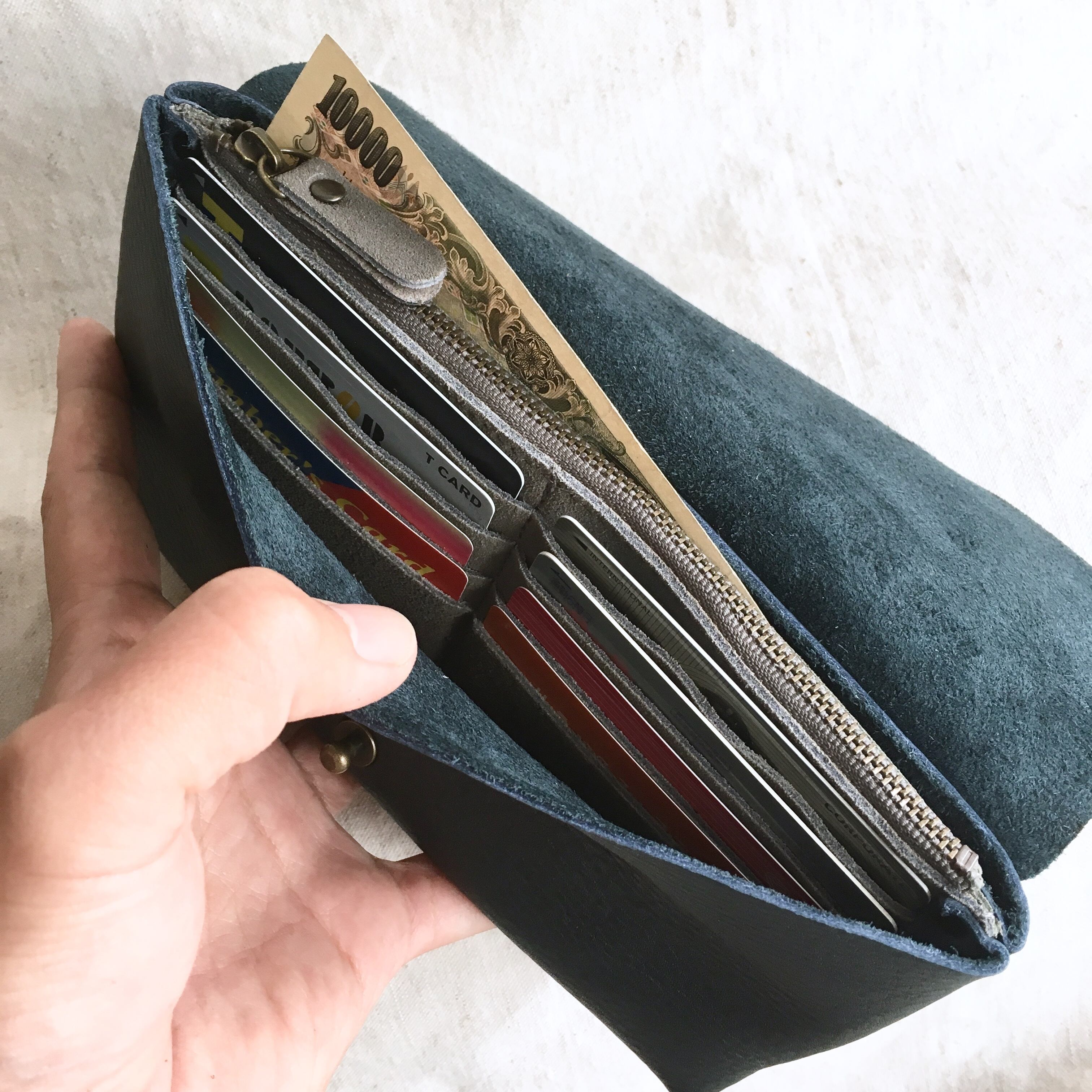 牛シュリンクレザーと牛床ベロアのシンプル長財布になります。