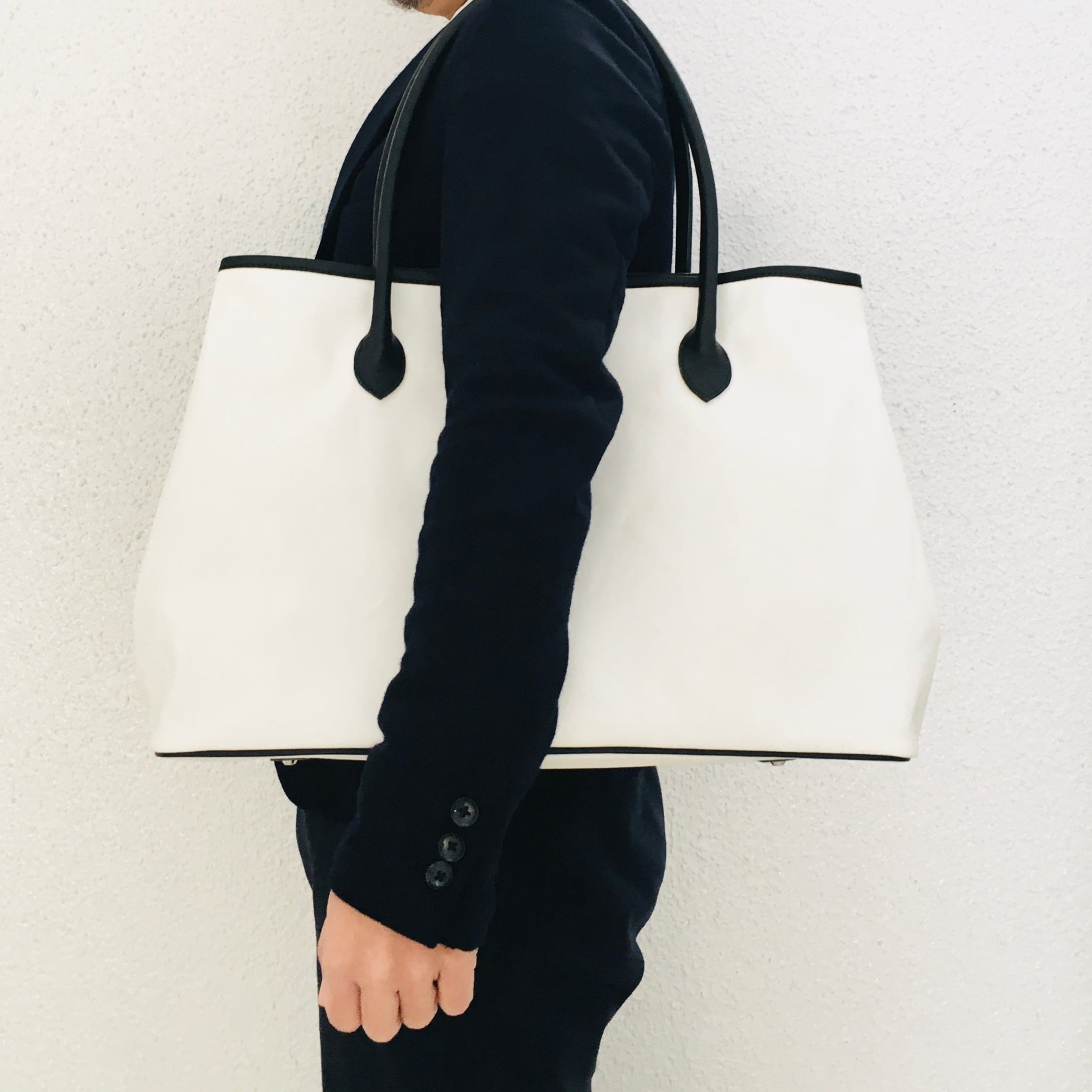 大容量 自立する11号帆布とレザーのワイドトートバッグ【オフホワイト】