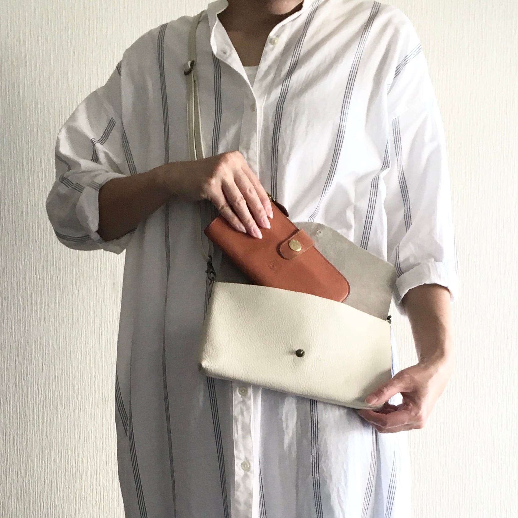 長財布や携帯電話がスッポリとおさまるシンプルショルダーバッグ。