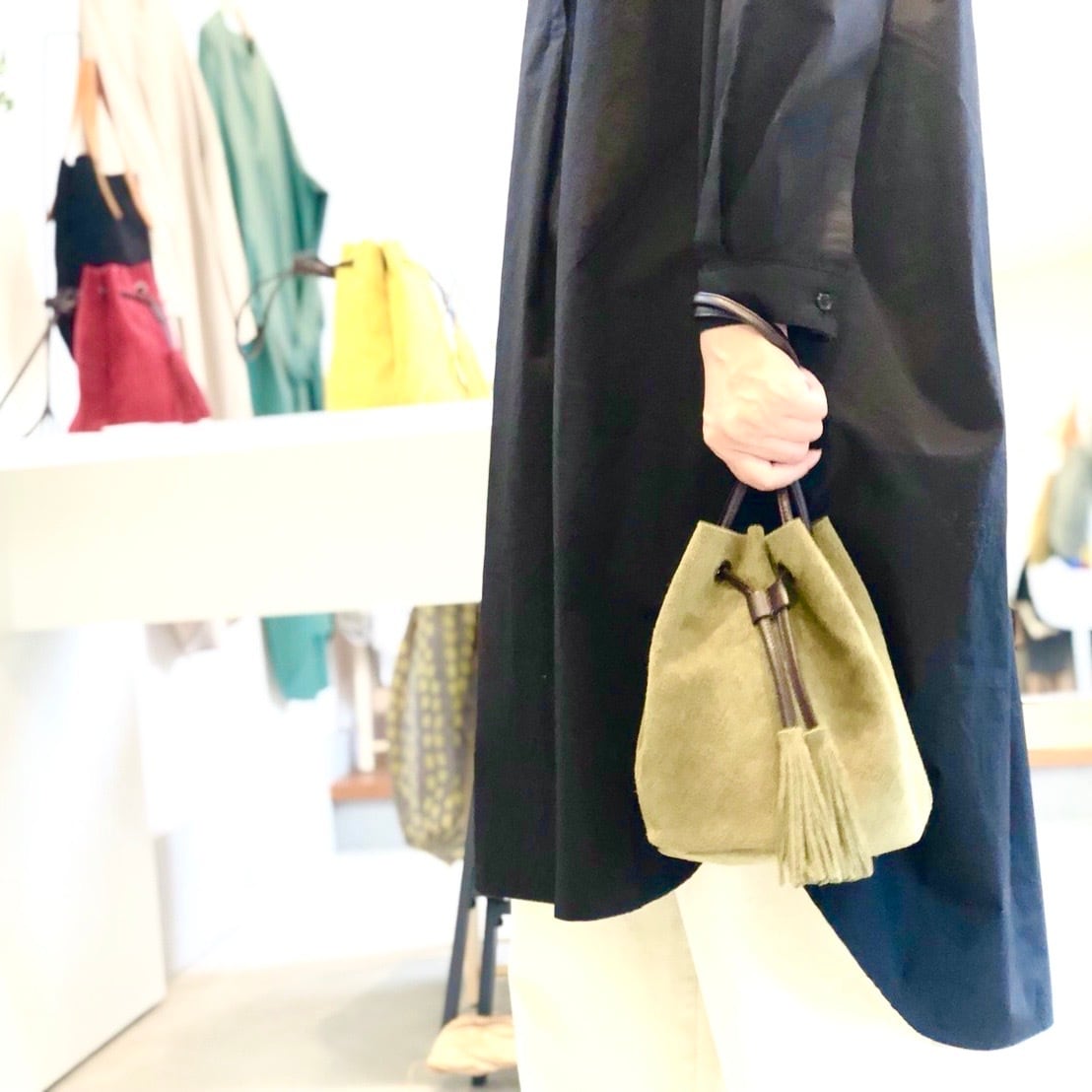 【2025再販】牛床ベロアのタッセル付2WAY巾着バッグ【オリーブ】