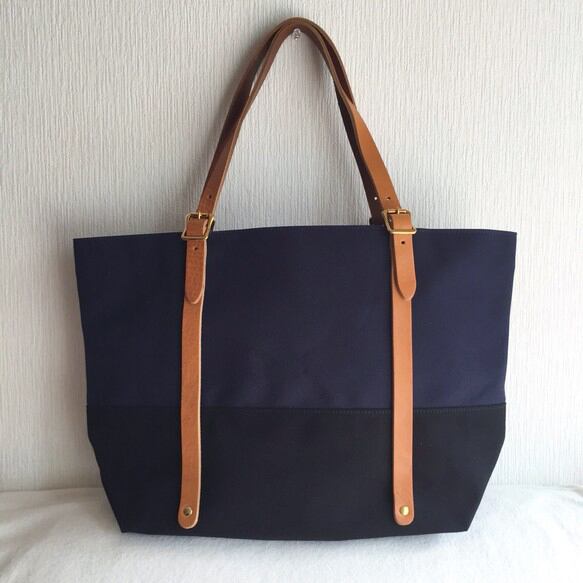 6号帆布と極厚オイルヌメのトートバッグ L-size【ネイビー×ブラック】親子コーデにも