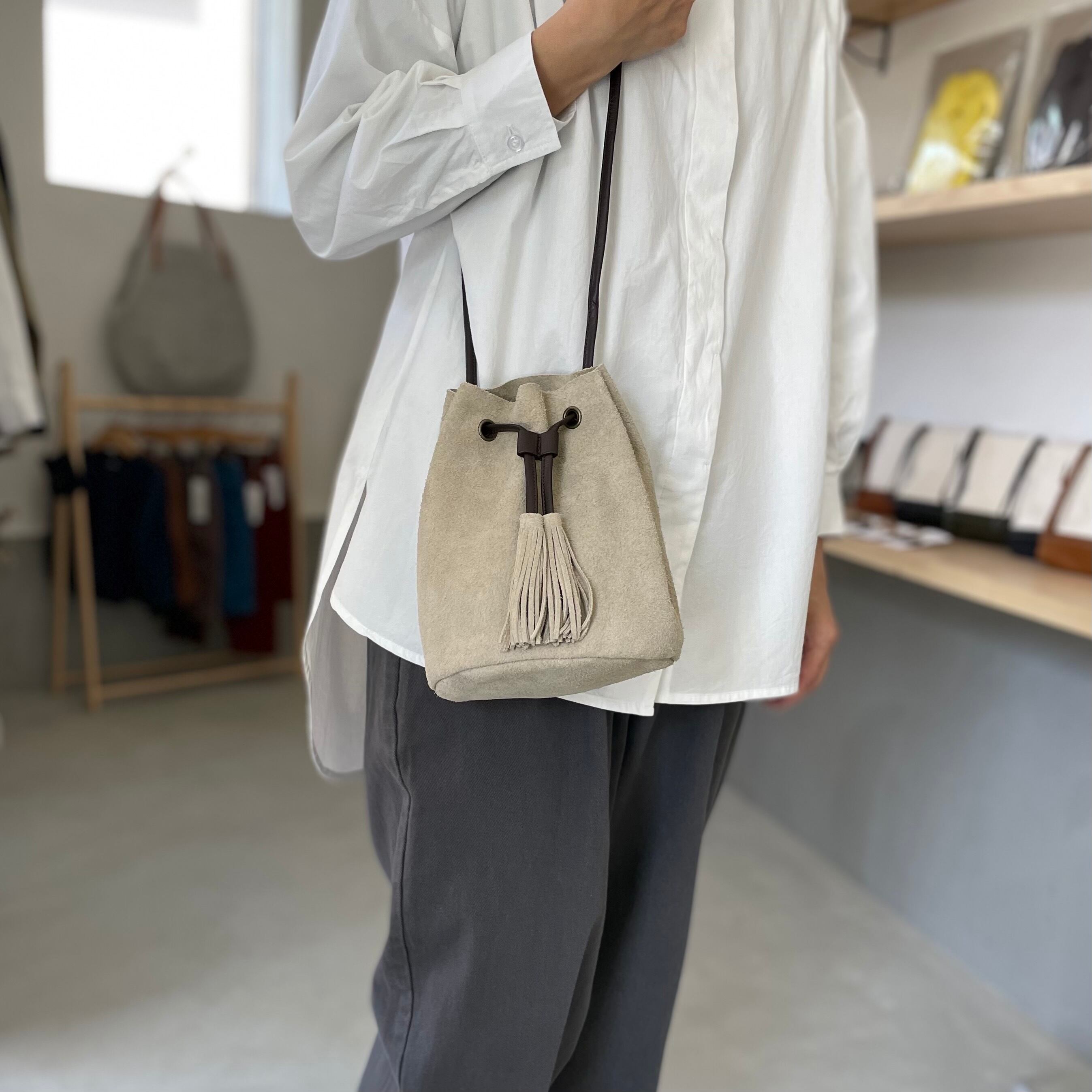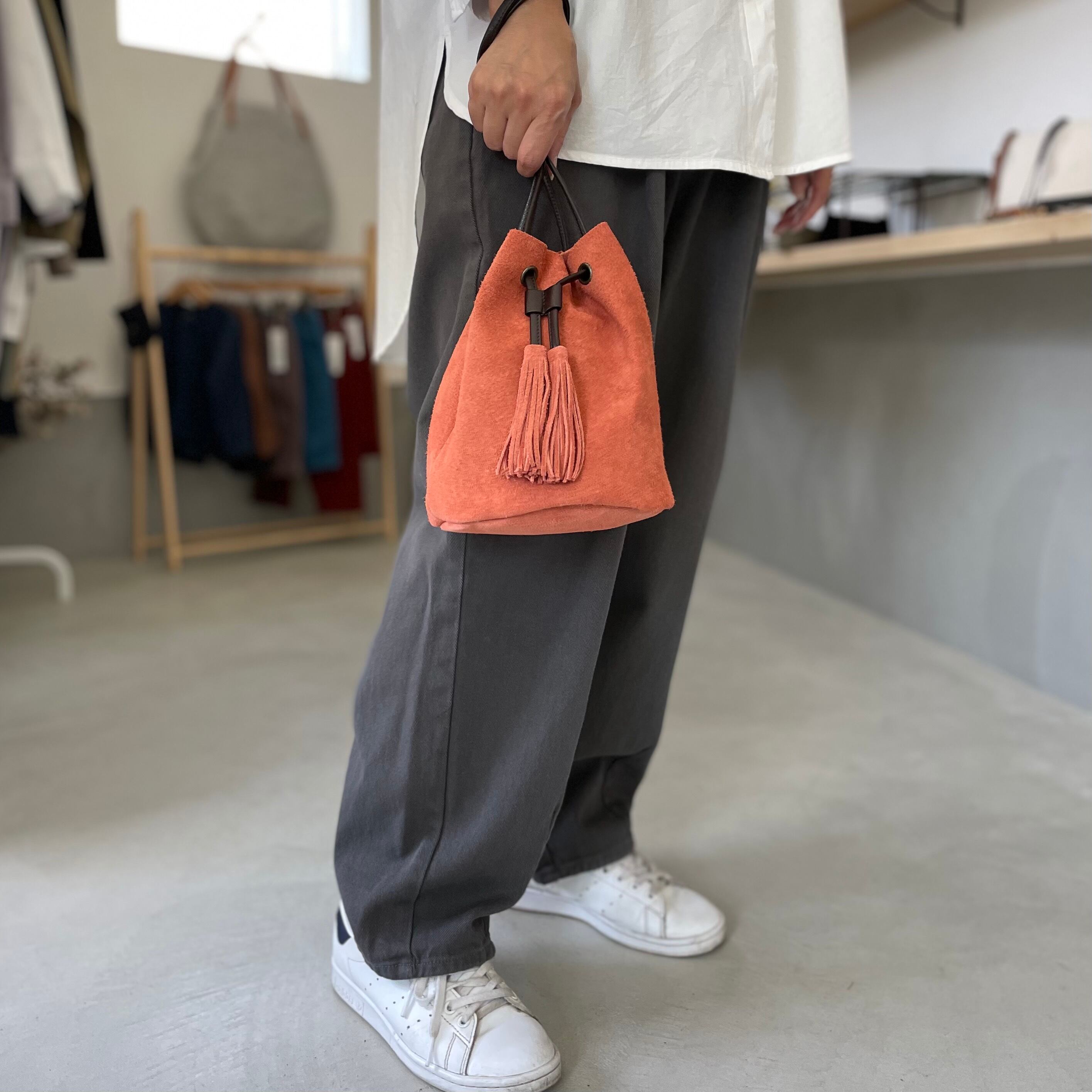 牛床ベロアのタッセル付2WAY巾着バッグです。