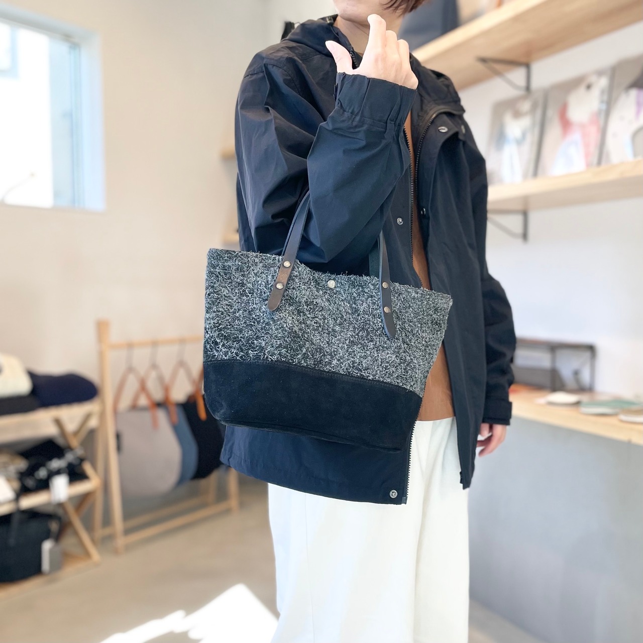アンゴラベロア×牛床ベロアと極厚のヌメを使用したマチ分量たっぷりの切り替えトートバッグです。