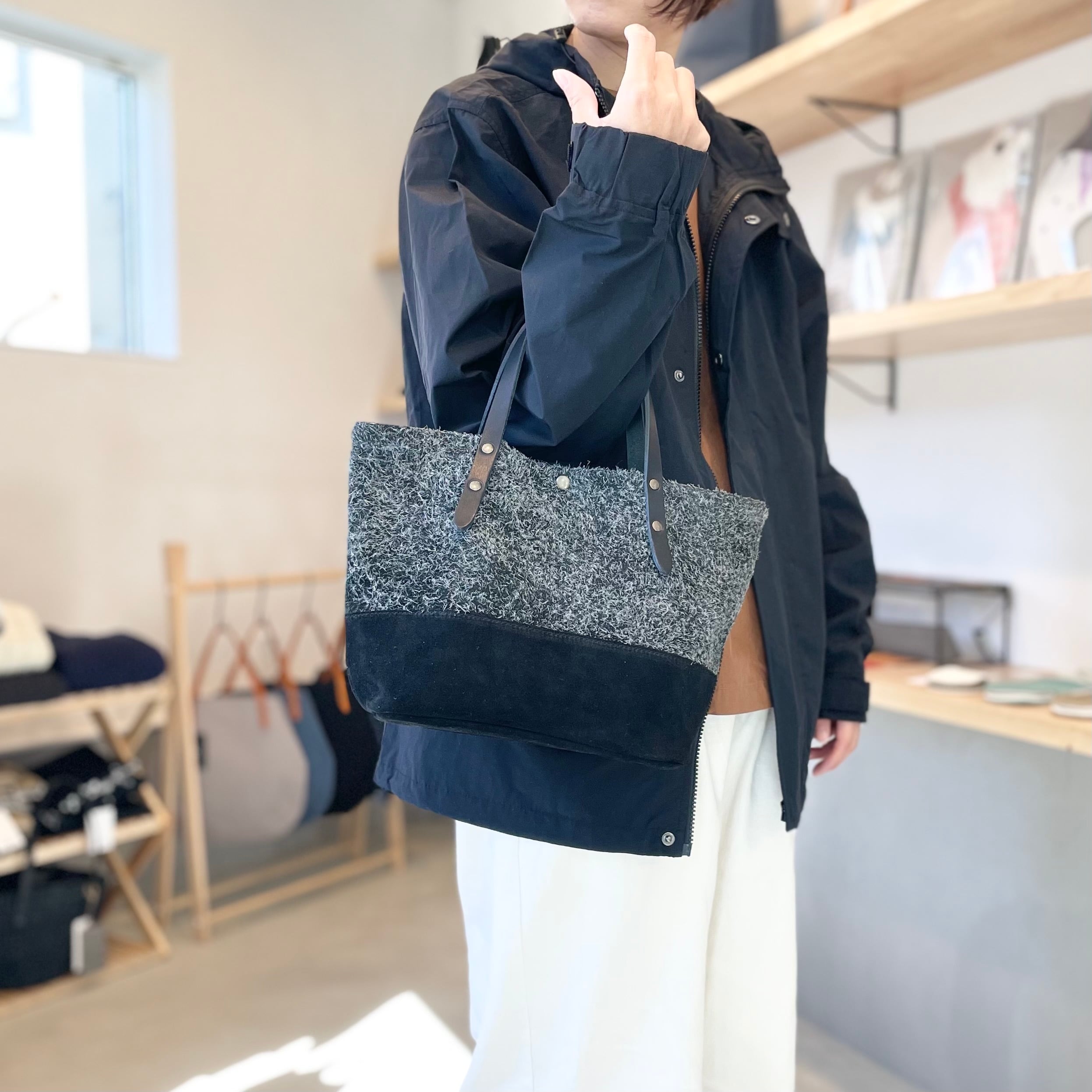 「本革」アンゴラベロア×牛床ベロアと極厚ヌメの切り替えトートバッグ【チャコールグレー×ブラック】
