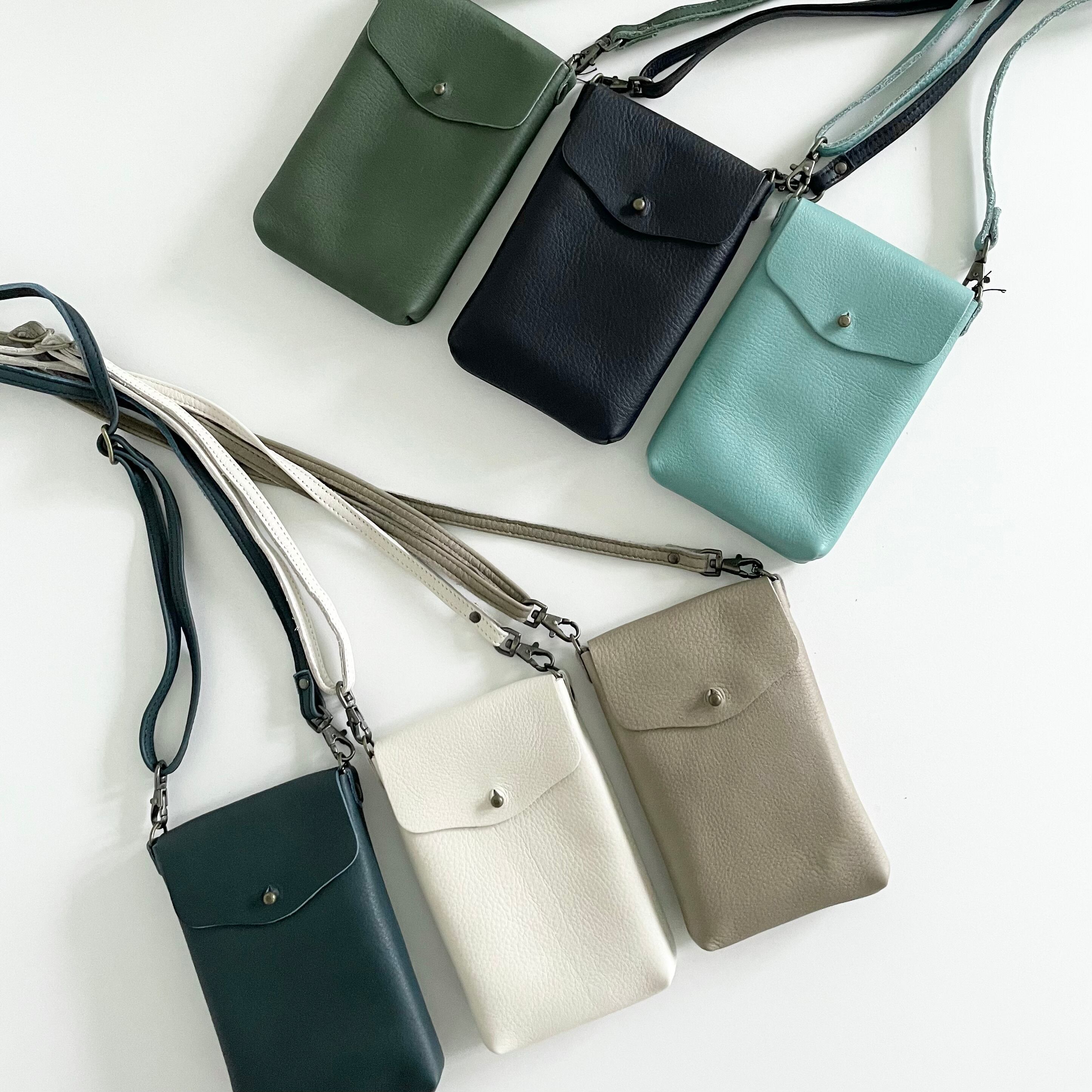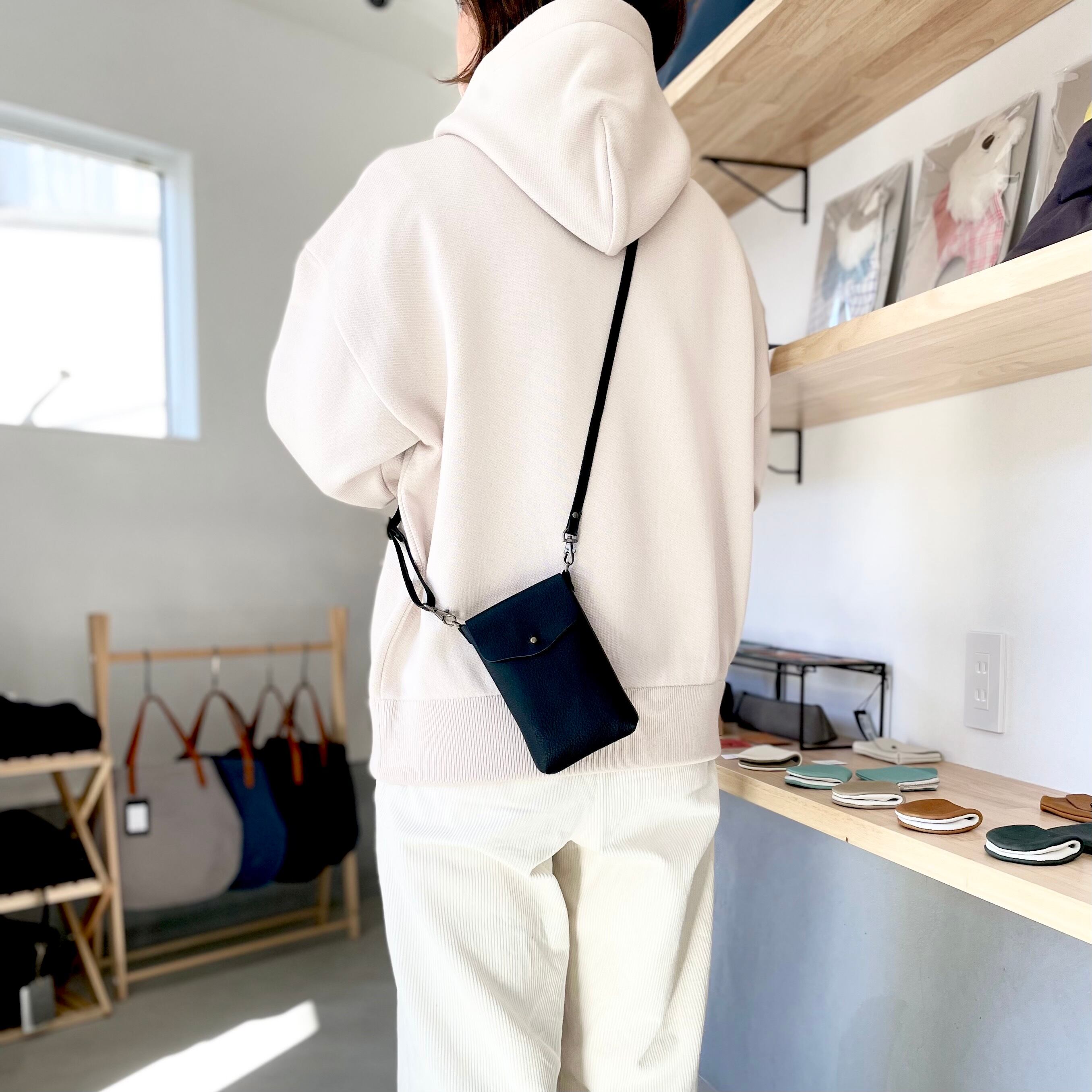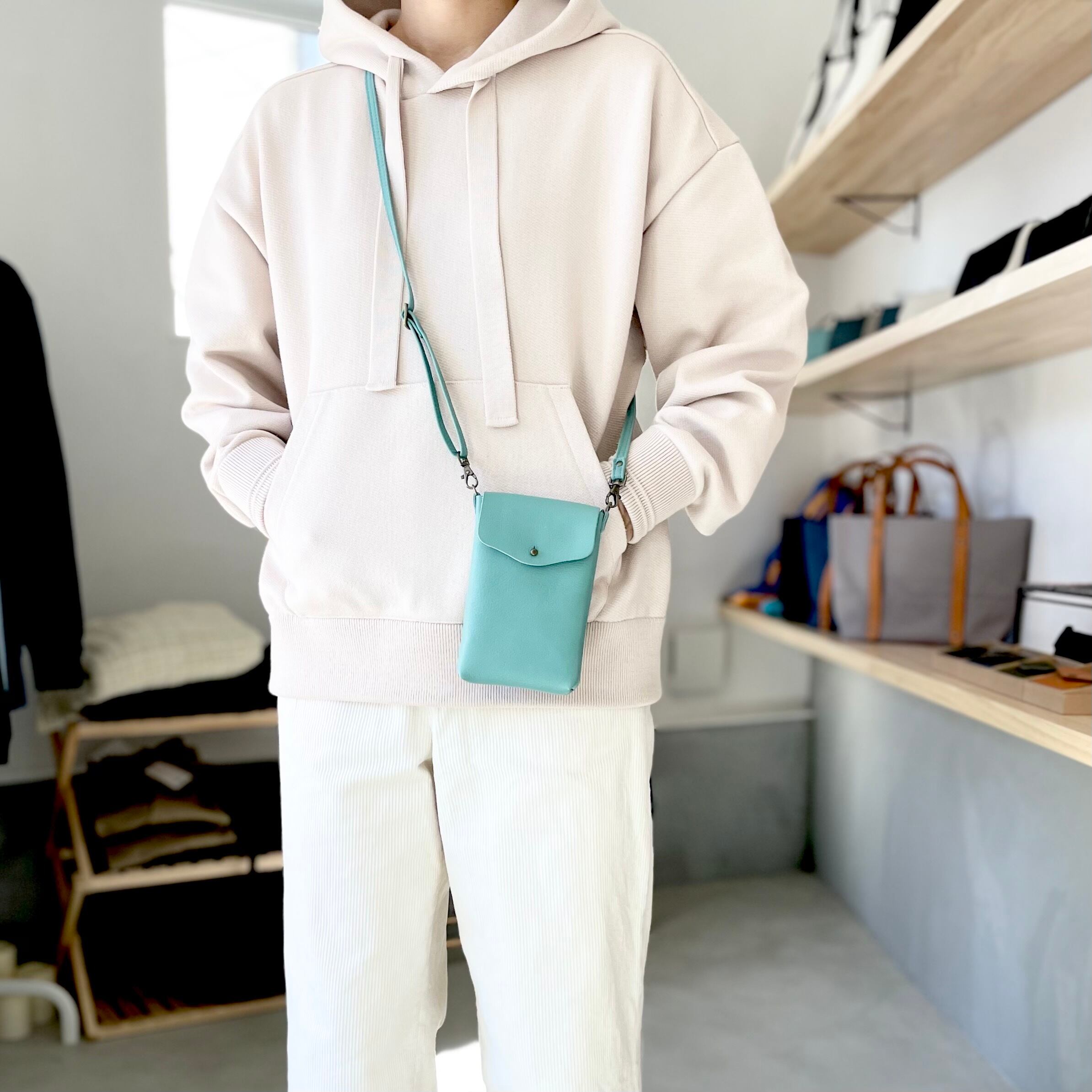 携帯電話やミニマルコインケースがスッポリとおさまるシンプルスマホポシェット。
