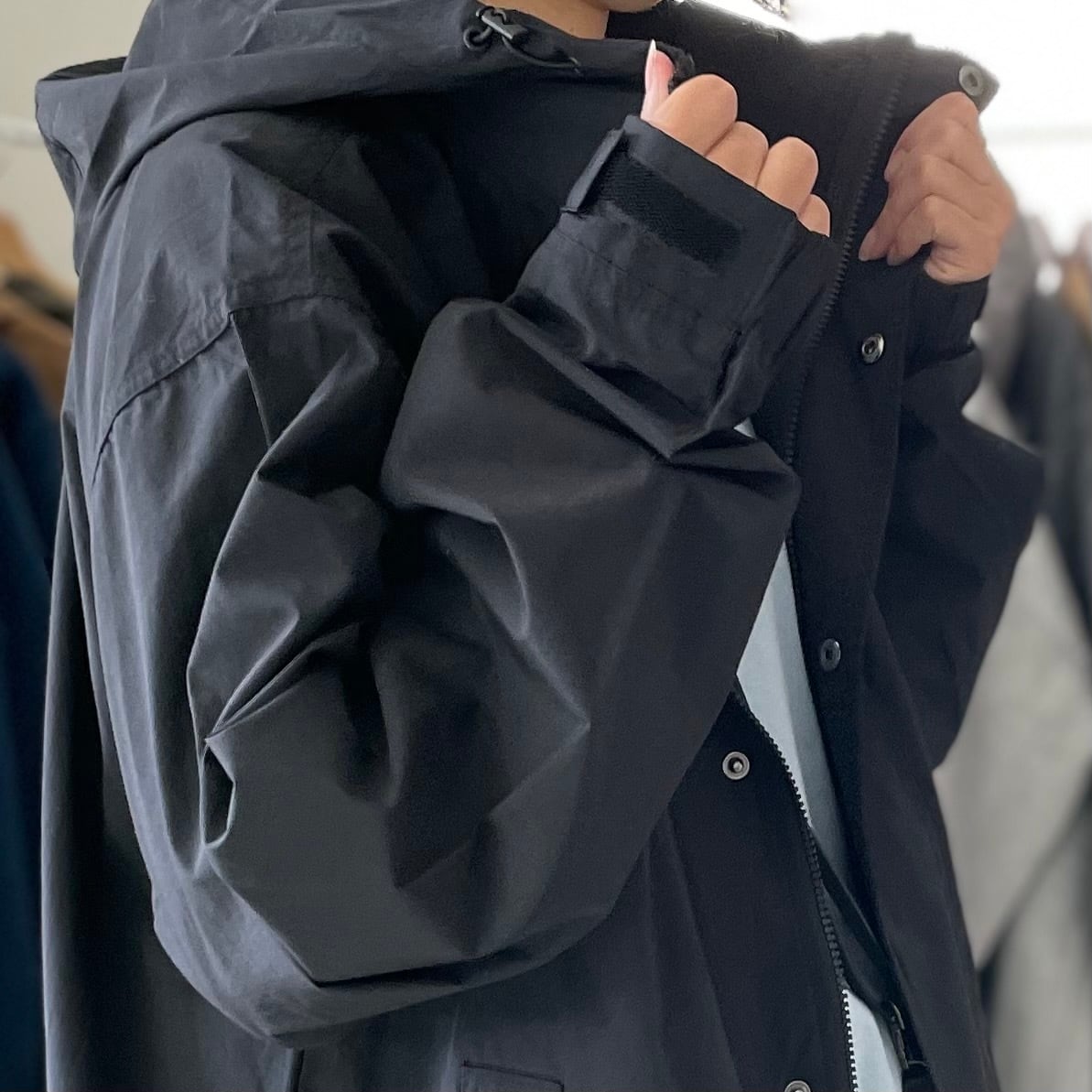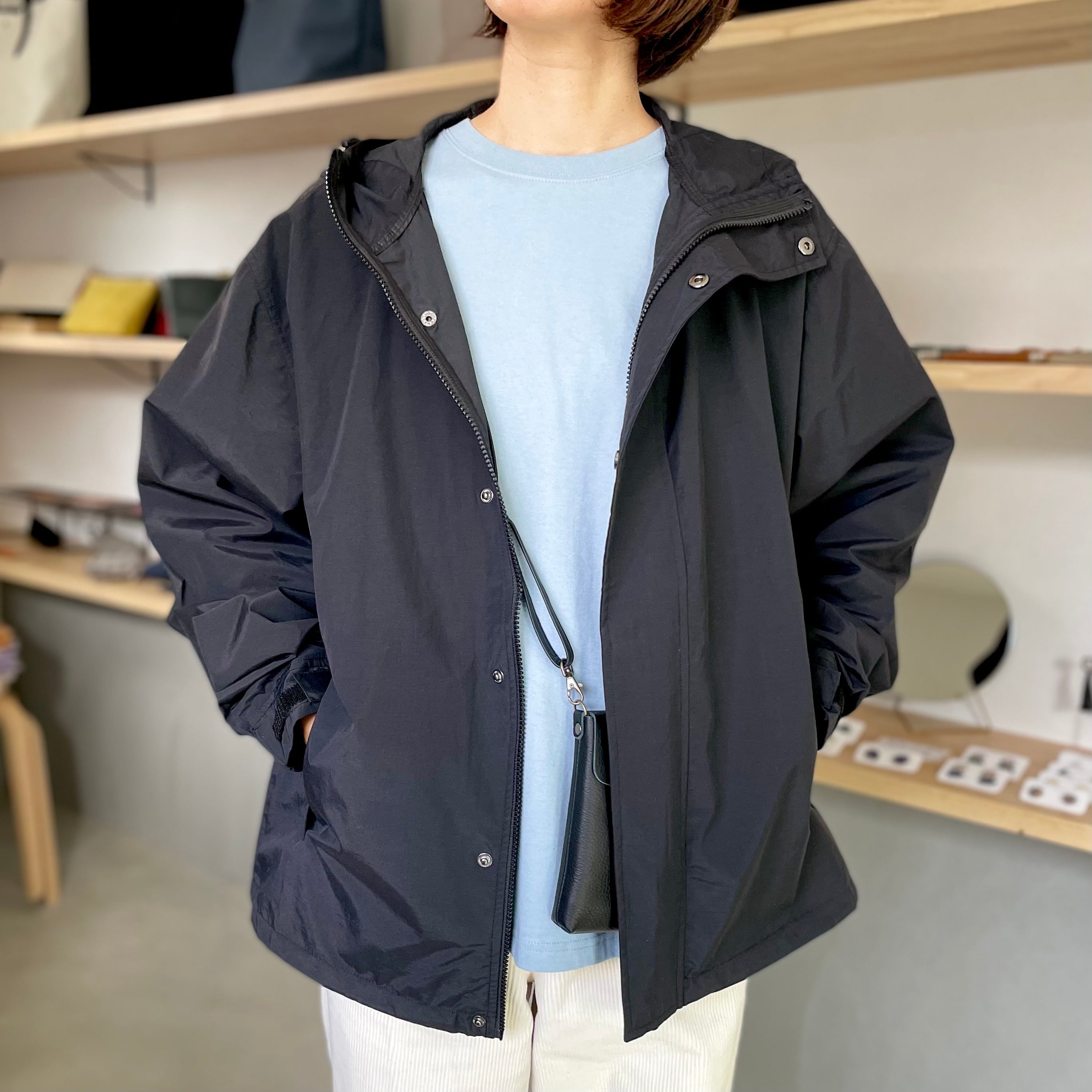 一重生地ながら比翼付きのフロントファスナーや裾・フードのドローコード、