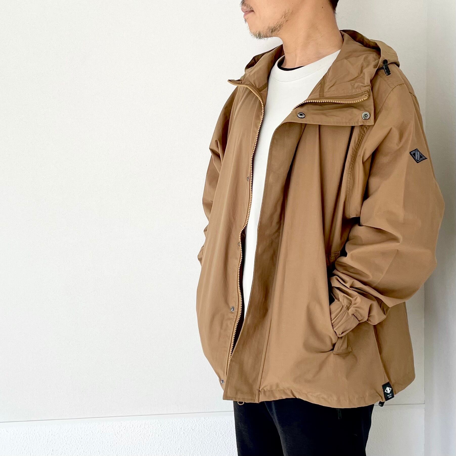 一重生地ながら比翼付きのフロントファスナーや裾・フードのドローコード、