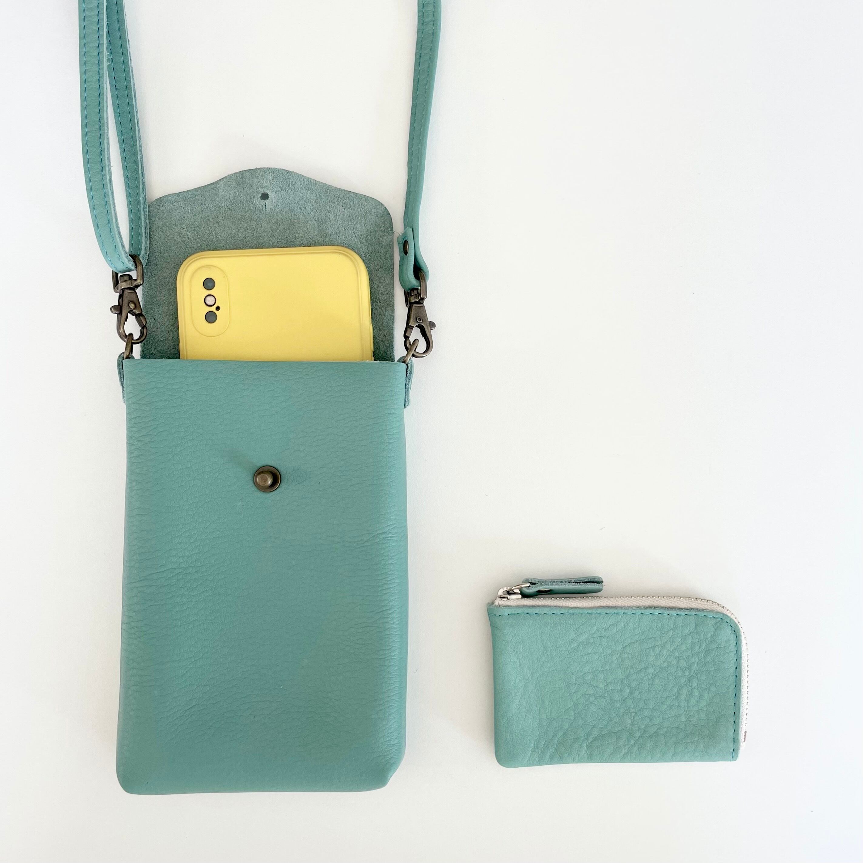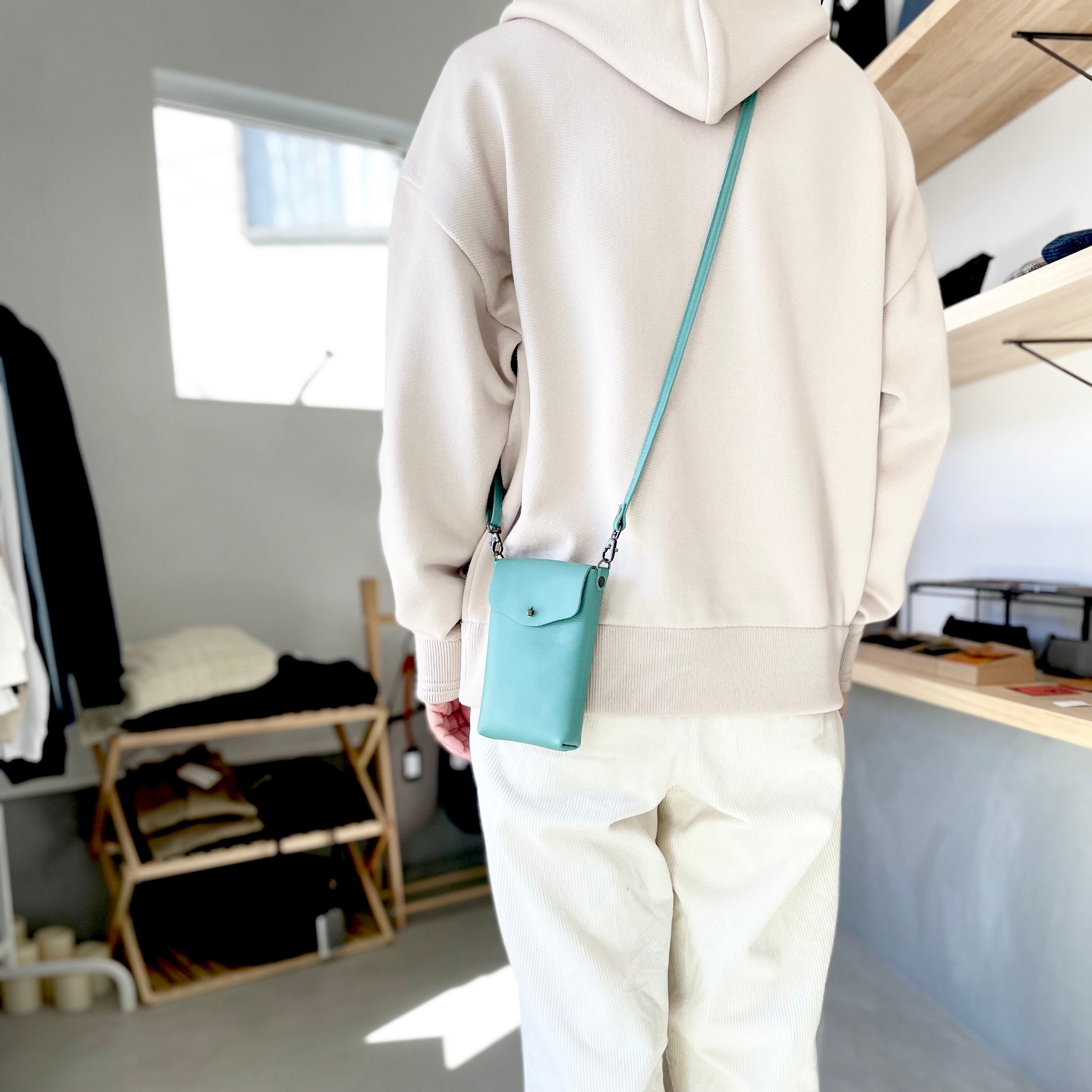 携帯電話やミニマルコインケースがスッポリとおさまるシンプルスマホポシェット。