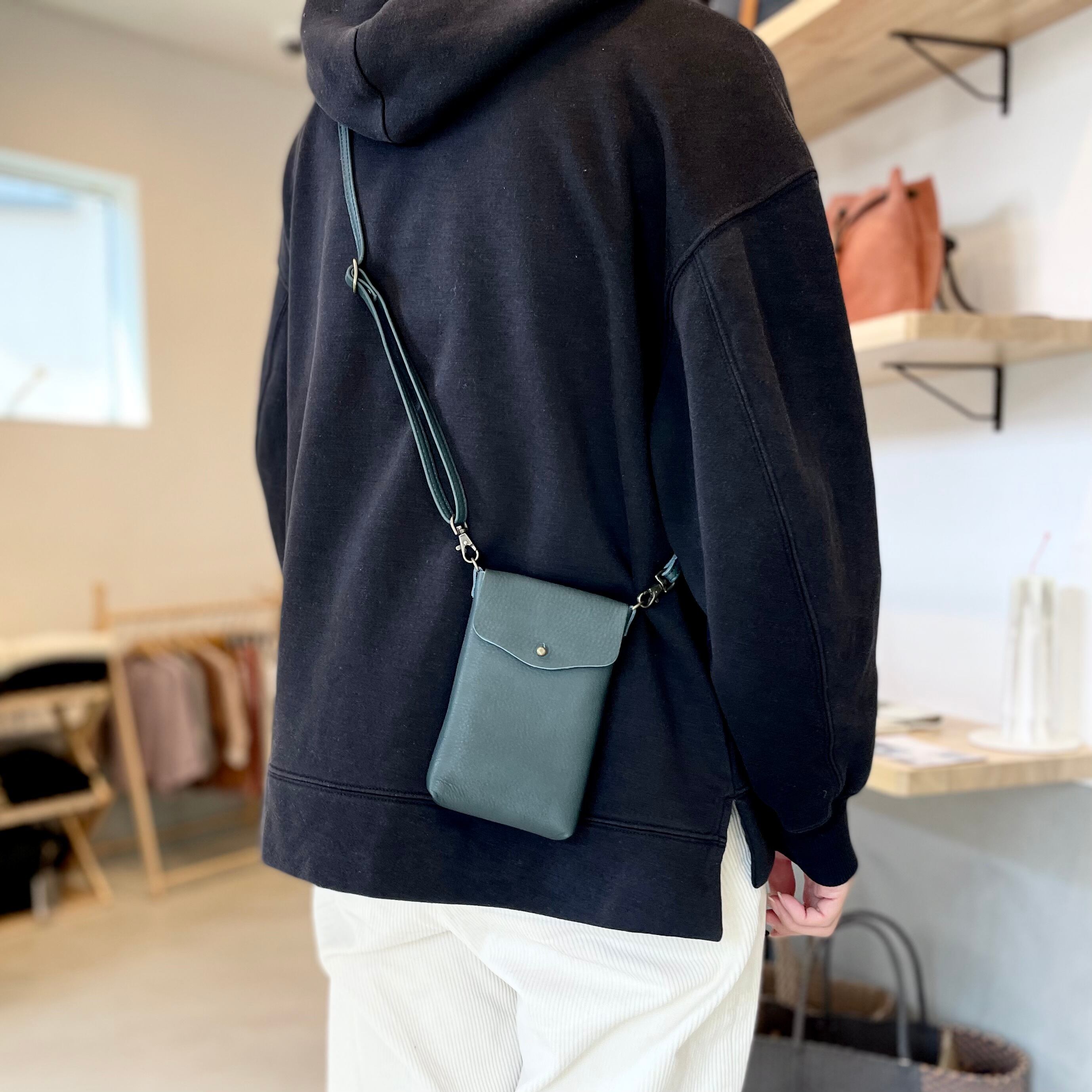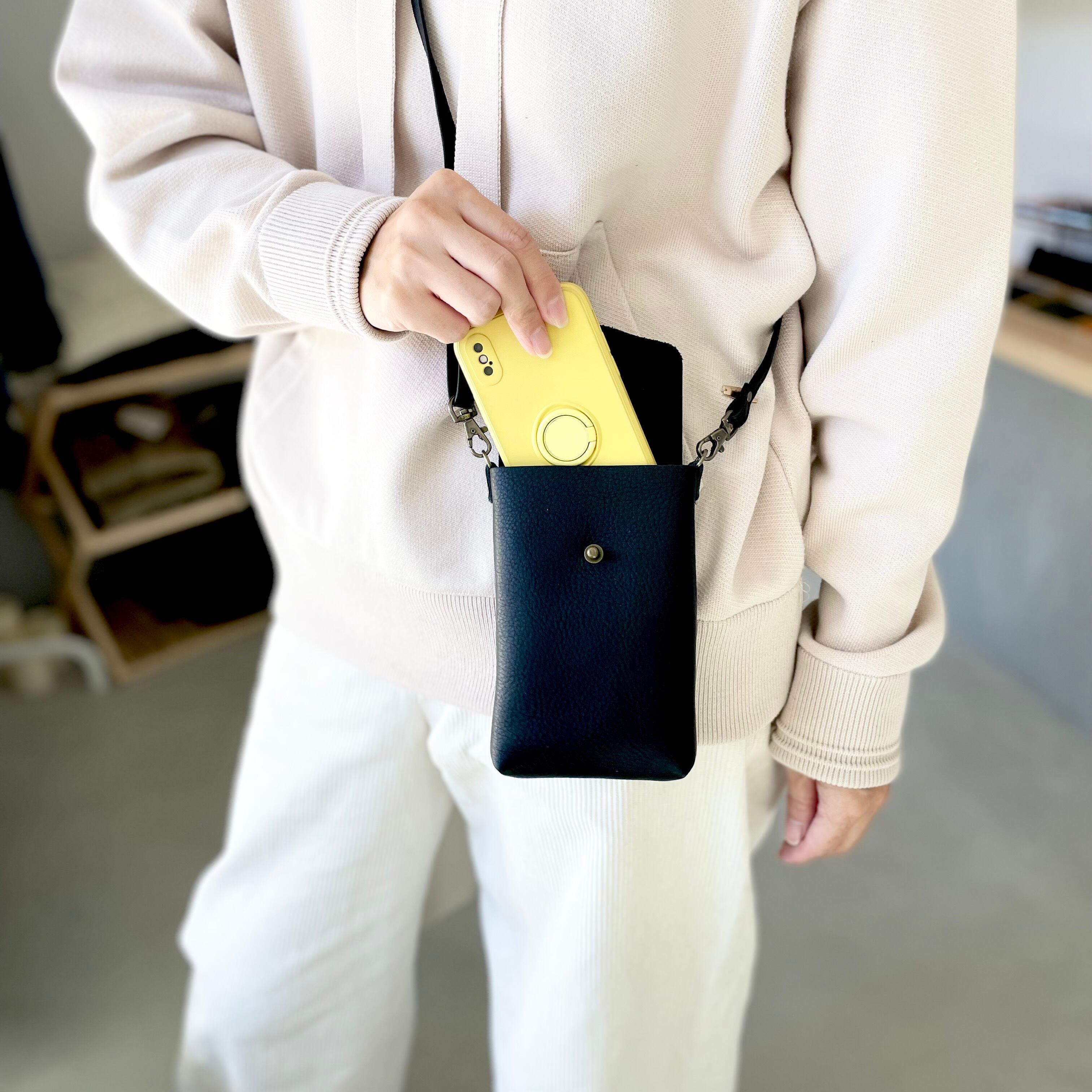 携帯電話やミニマルコインケースがスッポリとおさまるシンプルスマホポシェット。