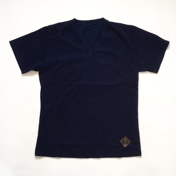 エイジングブルー レザーパッチ付インディゴ天竺のVネックTシャツ[Mサイズ]
