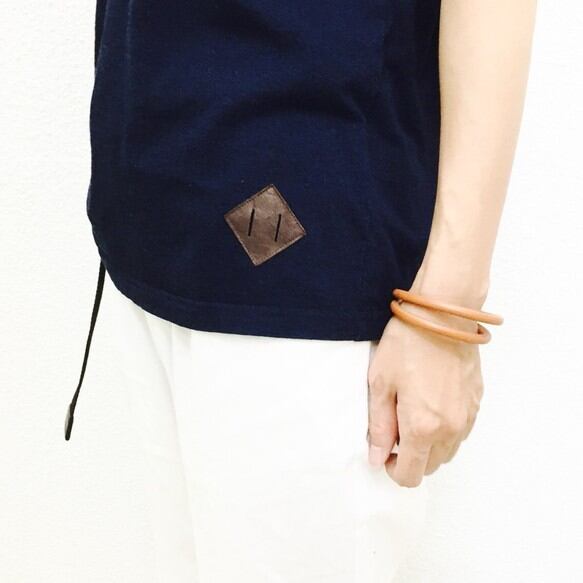 シンプルなVネックTシャツに牛革のパッチをワンポイントで付けました。