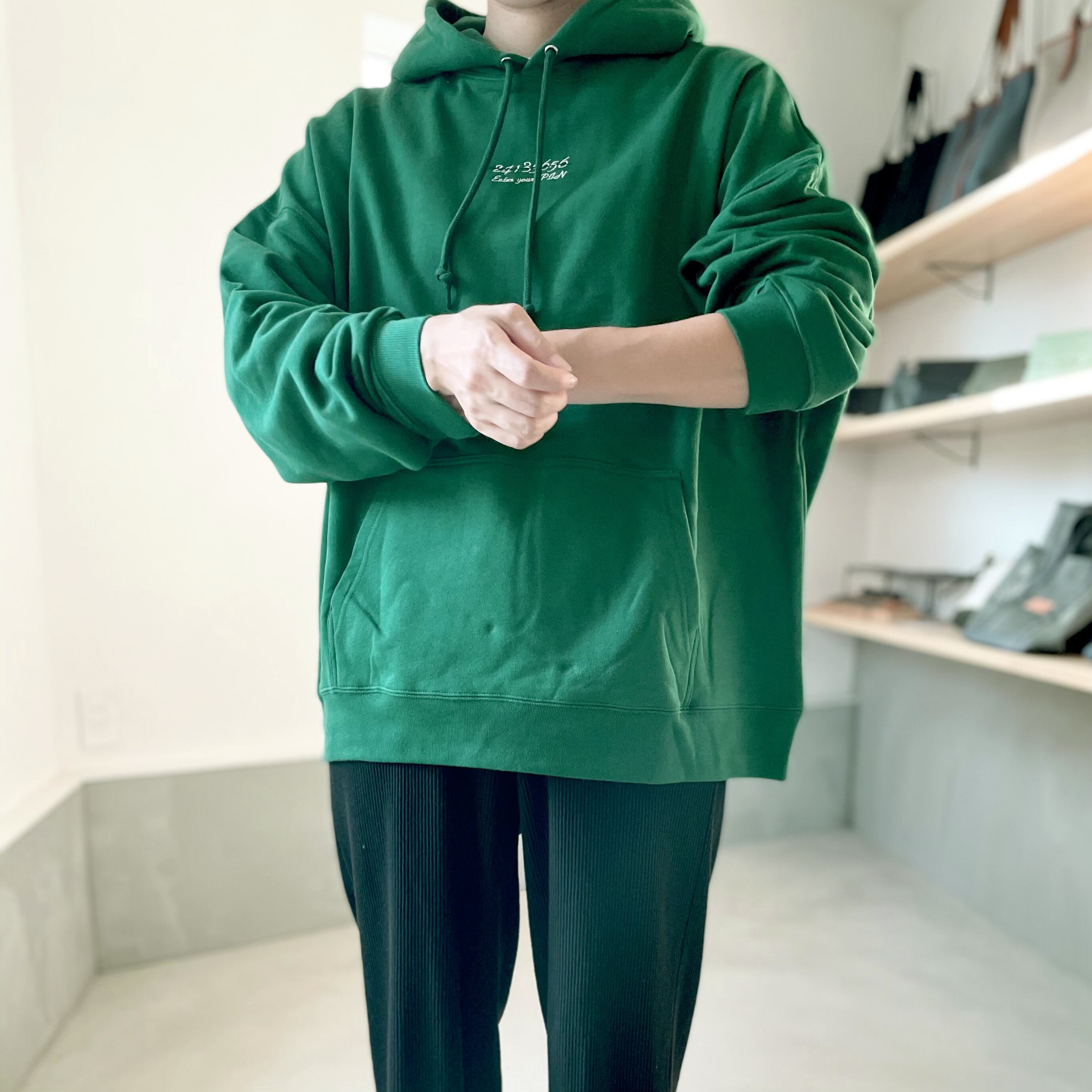 【ユニセックス 】刺繍 ビッグシルエット スウェット プルオーバー パーカ 裏パイル【グリーン】