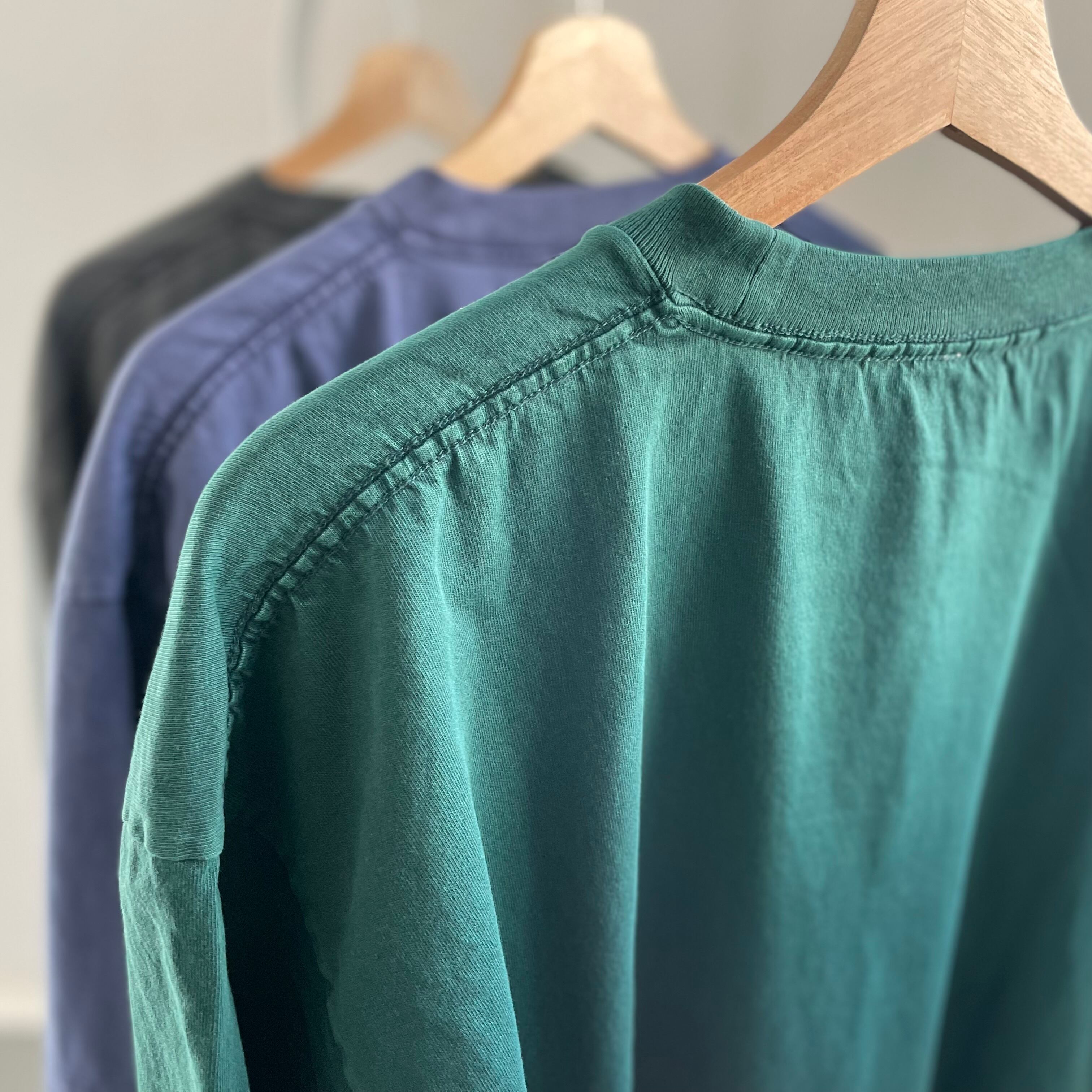 古着のような独特な風合いとアタリ感で、無地なのに存在感のある仕上がりです。